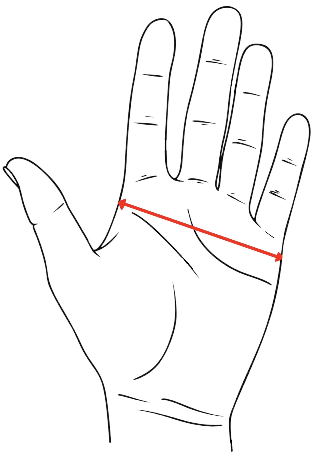 Um die richtige Größe zu ermitteln, messen Sie die Breite Ihrer Handfläche über die Fingerwurzelknochen (ohne den Daumen). Vergleichen Sie Ihr Maß mit unserer Größentabelle: